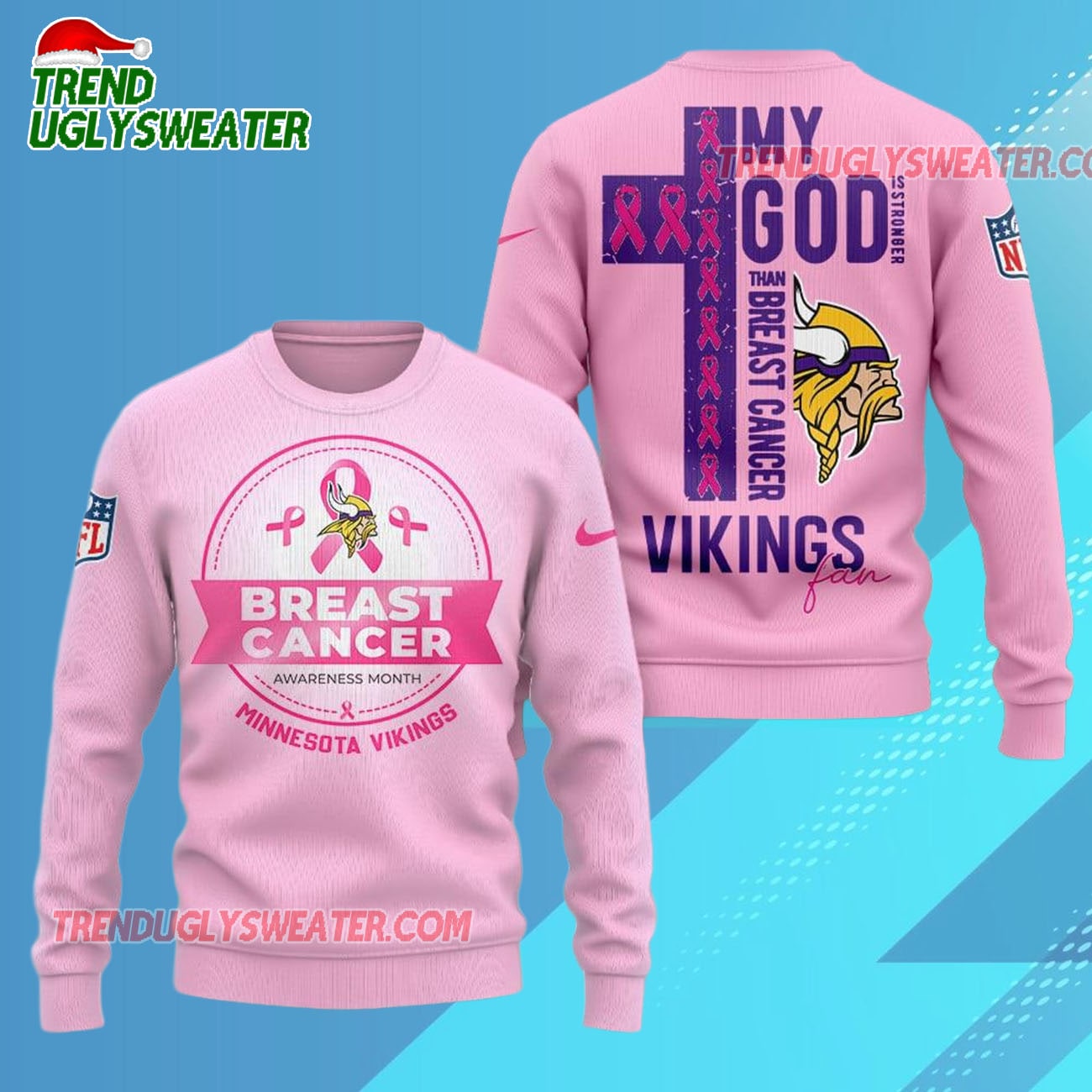 Limited-time offer: Don’t miss out! Visit trenduglysweater.com and order now to secure your Minnesota Vikings 2025 Nfl My God Is Stronger Than Breast Cancer Chritmas Sweater before the season kicks off — quantities are limited!