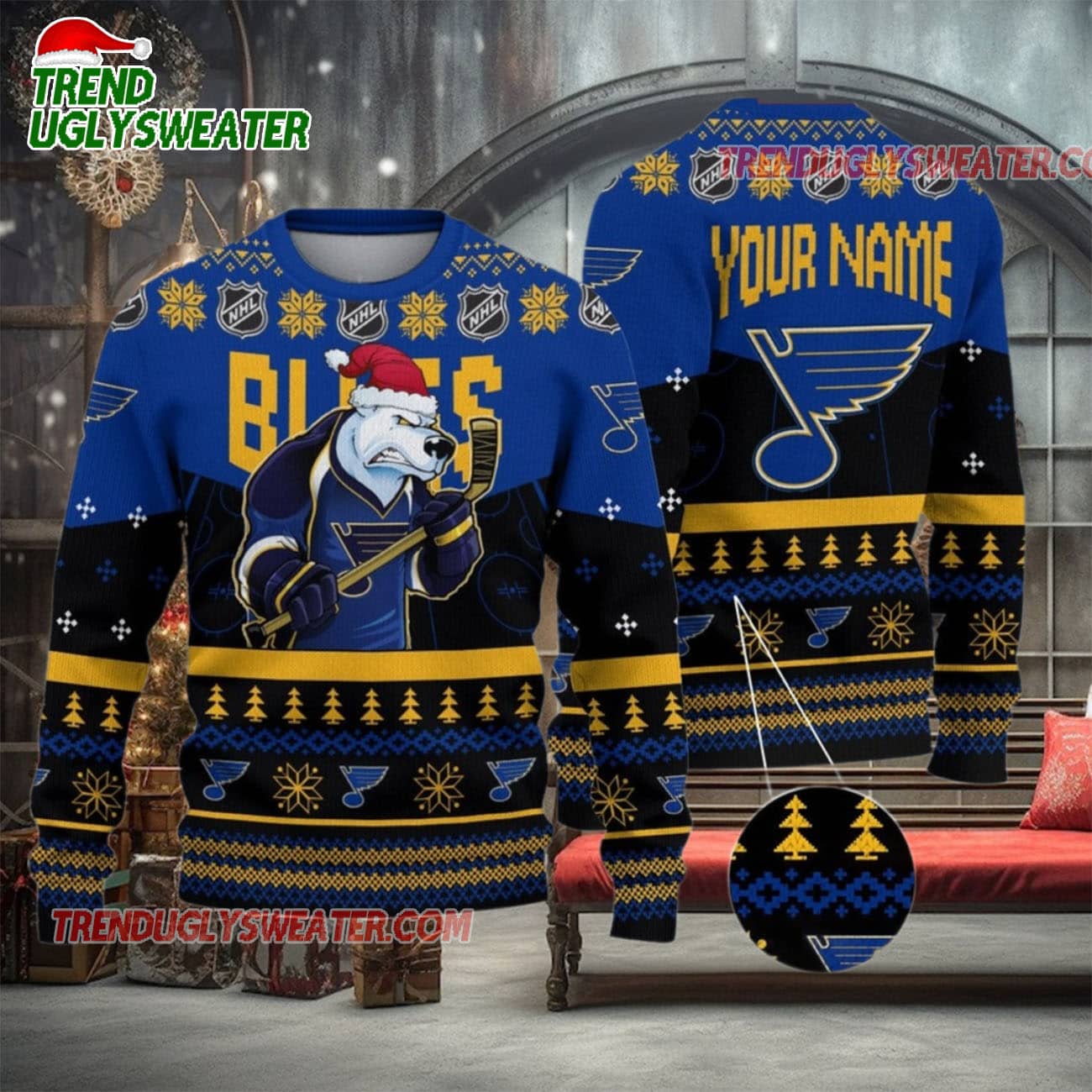 👉 Order your NHL St Louis Blues Mascot Fiery Skates Ugly Christmas Sweater today and be game-day ready in style!