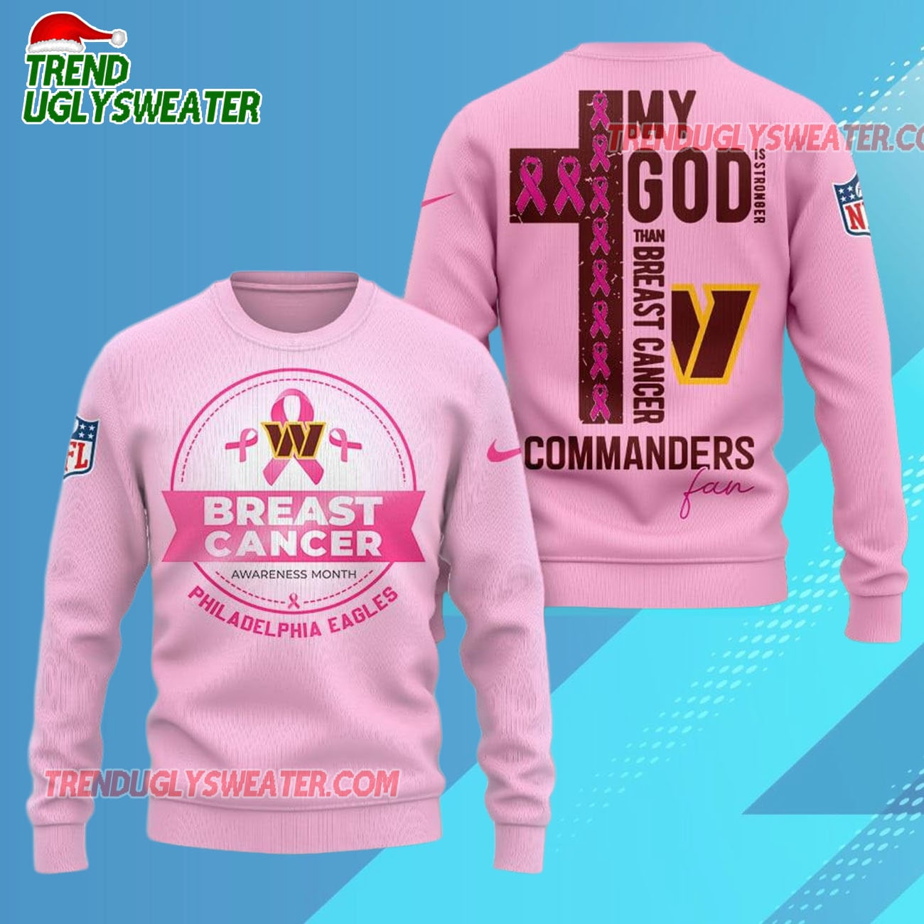 The Washington Commanders 2025 NFL My God Is Stronger Than Breast Cancer Chritmas Sweater is more than just a sweater; it’s a statement. This is your opportunity to embrace your love for sports, celebrate your team, and look great doing it. Available in sizes up to 5XL, the Washington Commanders 2025 NFL My God Is Stronger Than Breast Cancer Chritmas Sweater is perfect for fans of all sizes. Perfect for NFL watch parties, summer BBQs, or even casual game nights with friends — wear it to show your team pride wherever you go!